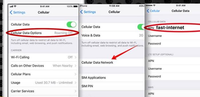 الإعدادات -الضبط ـ عام ـ خلوي ـ ثم شبكة البيانات الخلوية ثم يتم ادخال التالي